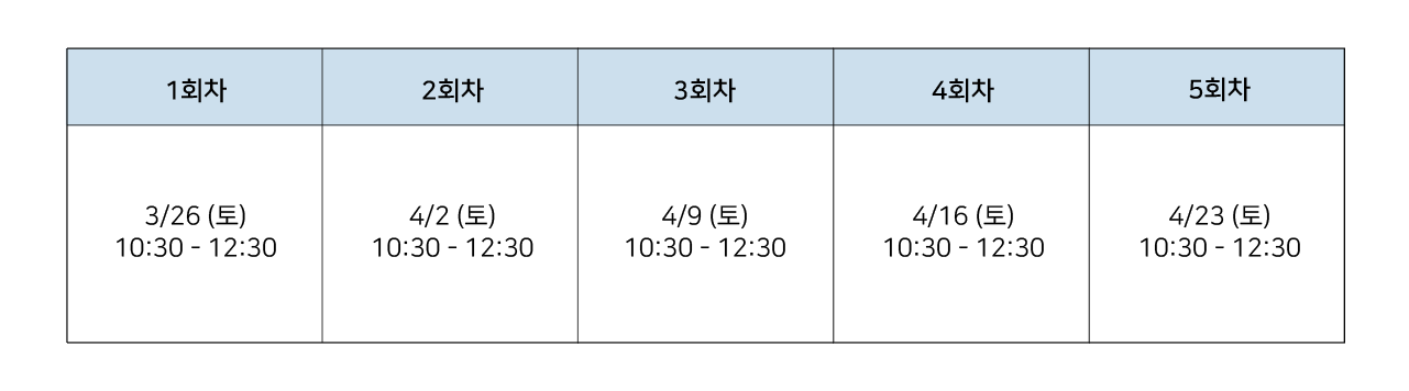 3/26 (토) 에 시작하여 매주 토요일 10:30 - 12:30 (2시간)동안 진행됩니다.